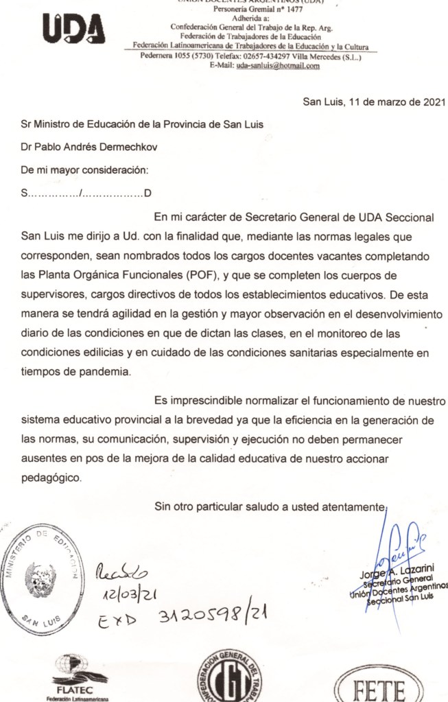 En nota Presentada en el Ministerio de Educación de la Provincia, con la firma de su Secretario General Jorge Lazarini, UDA Seccional San Luis. Pide la cobertura total de todos los cargos vacantes del sistema educativo provincial.