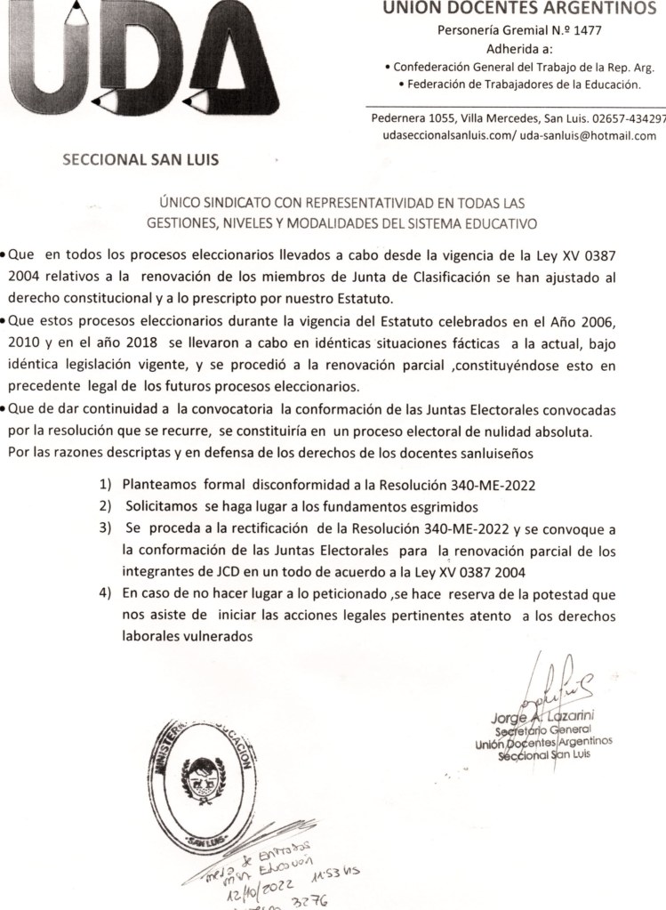 El día 12 de octubre, el Sindicato UDA presentó dos notas en las que se impugna y se argumenta la disconformidad por la violación de distintos artículos del Estatuto Docente, que se relacionan con el proceso electoral para la renovación de los integrantes de Junta de Clasificación Docente de las seis regiones educativas.