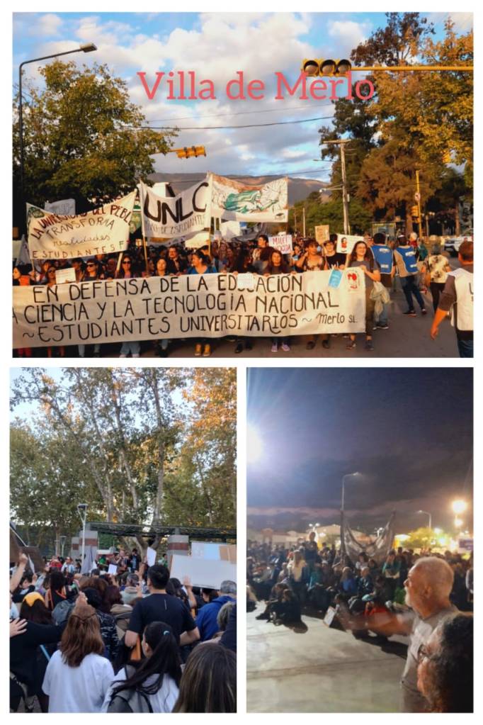 La protesta en la Villa de Merlo comenzó con una concentracion en la Plazoleta del Casino dirigiéndose por la Avenida del Sol, hasta llegar a la Rotonda de Ingreso a Merlo, donde participaron varios oradores y al finalizar se realizaron diversas actividades culturales por parte de varias organizaciones.